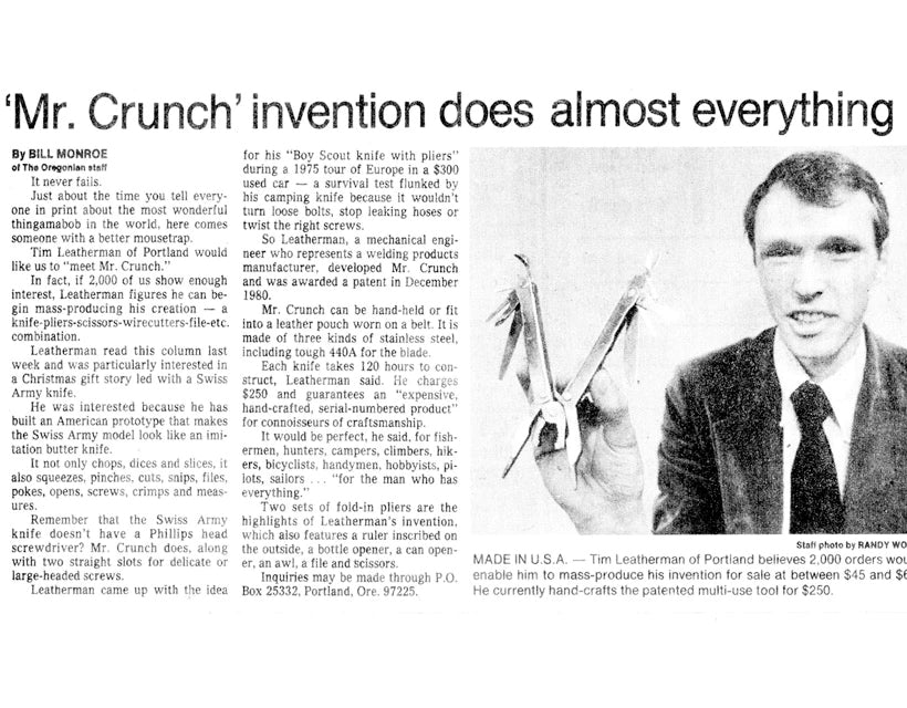 Tim Leatherman (an Oregon native) received his Mechanical Engineering degree from Oregon State University. While on a budget trip to Europe in 1975, Tim and his wife Chau constantly came across leaky hotel plumbing and road-side fixes for their cranky Fiat. Tim realized the need for a pliers based, multi-purpose tool. "I was carrying a scout knife and used it for everything from slicing bread to fixing the car. But I kept wishing I had a pair of pliers!".